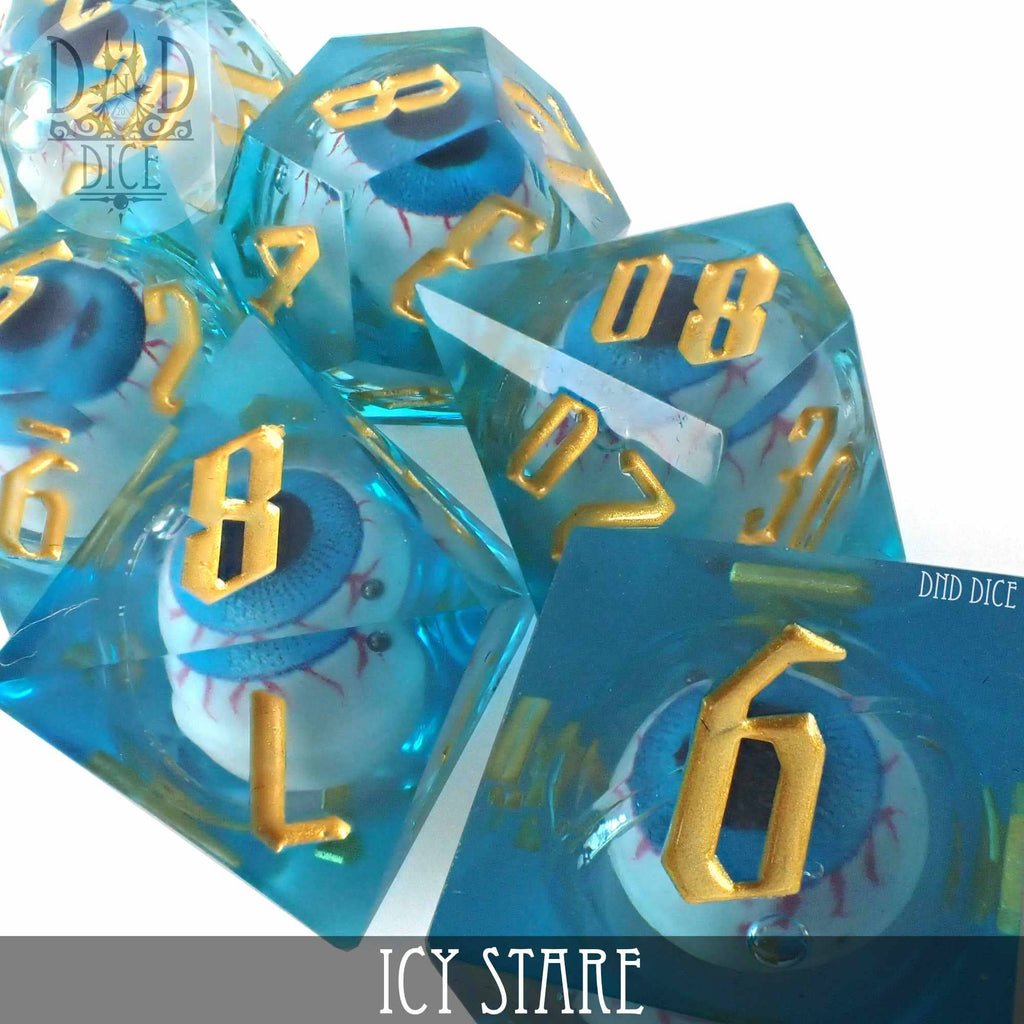 Note: The D4 has the eye in a fixed position. However, the eyes in the D6, D8, D10, D%, D12 and D20 are suspended in a liquid core and will move around while the dice are in motion. Packaging: Bottle 7 Dice Set Includes: * 1-D4 (20mm) * 1-D6 (17mm) * 1-D8 (17mm) * 1-D10 (17mm) * 1-D% (17mm) * 1-D12 (18mm) * 1-D20 (20mm) Material: Resin