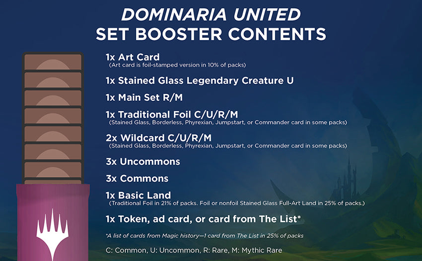 Each Dominaria United Set Booster Box contains 30 Dominaria United Set Booster Packs and 1 foil box topper card.