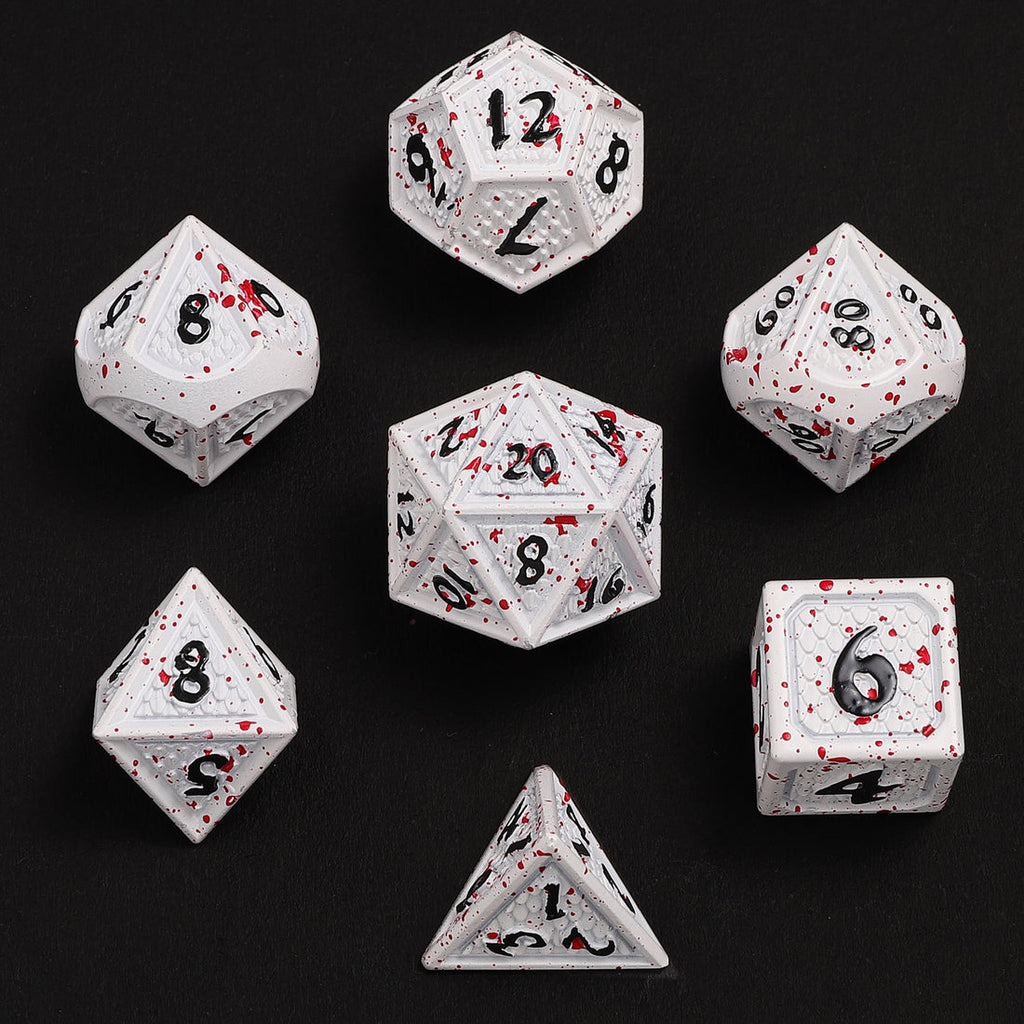 Set of 7 polyhedral dice in solid metal Matt White w/Blood Spitters.