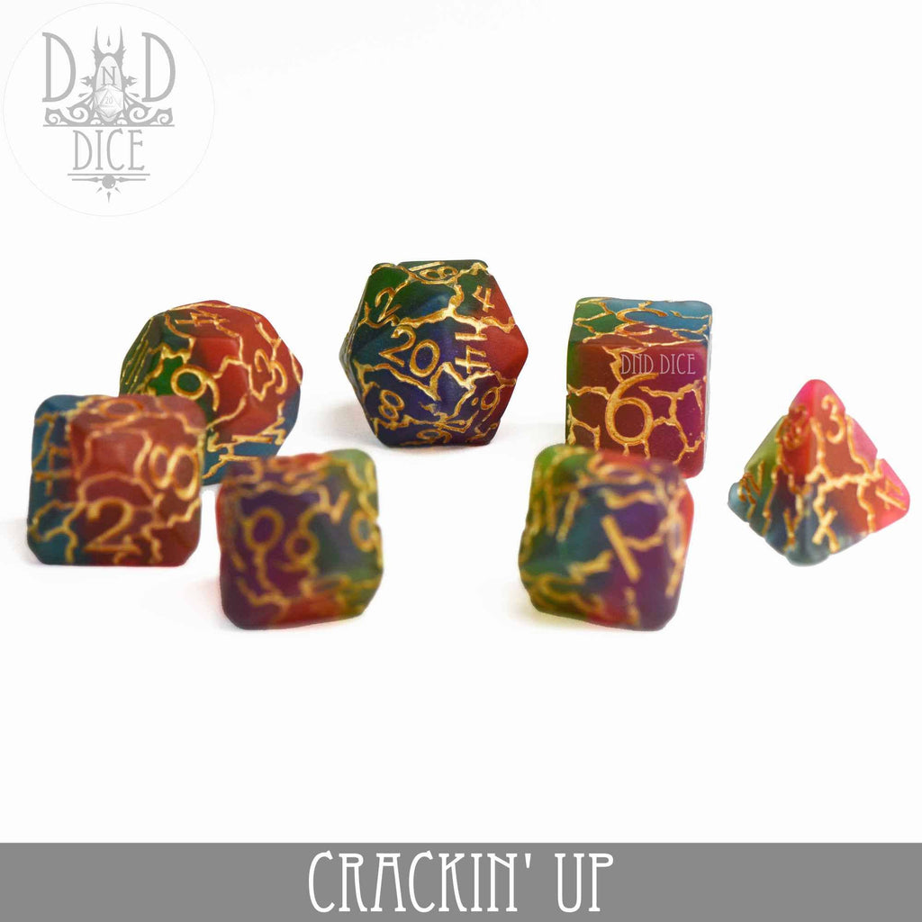Note: This is a frosted dice set. Packaging: Bottle 7 Dice Set Includes: * 1-D4 (18mm) * 1-D6 (16mm) * 1-D8 (16mm) * 1-D10 (16mm) * 1-D% (16mm) * 1-D12 (18mm) * 1-D20 (20mm) Material: Resin