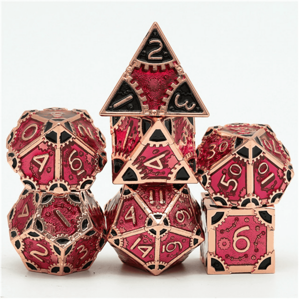 Foam Brain Games Metal Dice Set with gear details along the corners
