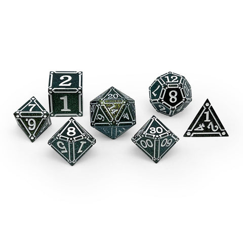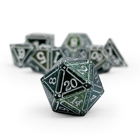 The Ironworks Legend. Whilst the dwarves were battling the dragon Nidhogg for control of their deep mountain mines and forges one of the walls was shattered. Upon inspection the entrance to a long forgotten iron works was discovered. Far from being ruined the iron works were in pristine condition; obviously they were hidden for a reason unknown to the modern dwarves. Inside they found the molds to a most amazing set of metal dice. A design of strength and power not seen in many ages. The smelting fires were lit, mythical metals and other magical materials were gathered from the stores inside the works. The results were of legend. Durable Material. Made from solid metal zinc alloy. They are strong, solid and ready for the challenge of any adventure. Each piece is meticulously designed to create a unique dungeon crawling experience. Easy-to-Read. Multiple plating and enamel color combinations make for easy-to-read numbers and a bit of colorful flash