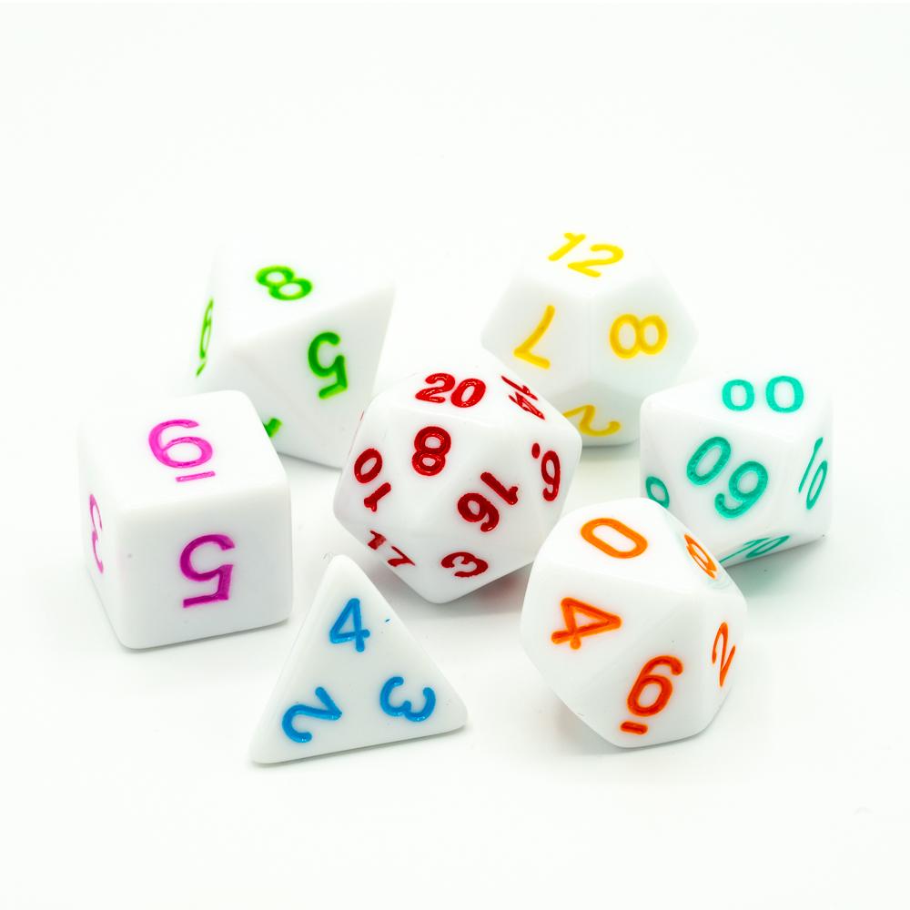 • Standard 7 piece RPG dice set in opaque white and inked in a variety of rainbow colors: green, yellow, teal, red, pink/purple, blue, and orange