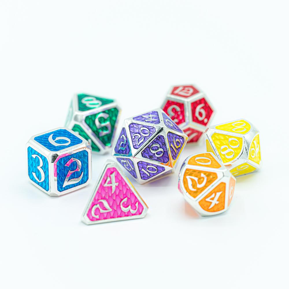 • Detailed in our exclusive Drakona dragonscale inlay in rainbow colors (pink d4, purple d20, blue d6, green d8, red d12, orange d10, and yellow d%) with silver electroplating