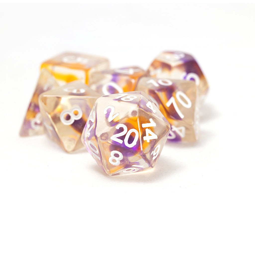 Bands of lustrious violet intertwine with golden yellow in crystal resin. This set of 7 polyhedral dice includes an extra glistening sunburst D20. Packaged in a flat-bottom tube, so you can easily carry and store your dice.