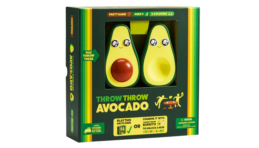 Place the pair of throwable Avocados on the table and deal out the cards. Earn points by collecting three of a kind. Play Avocado Cards and force your friends to battle. Duel to determine the winner. Duck, dodge, and dive squishy, airborne avocados or get hit and receive an Avocado Boo Boo!