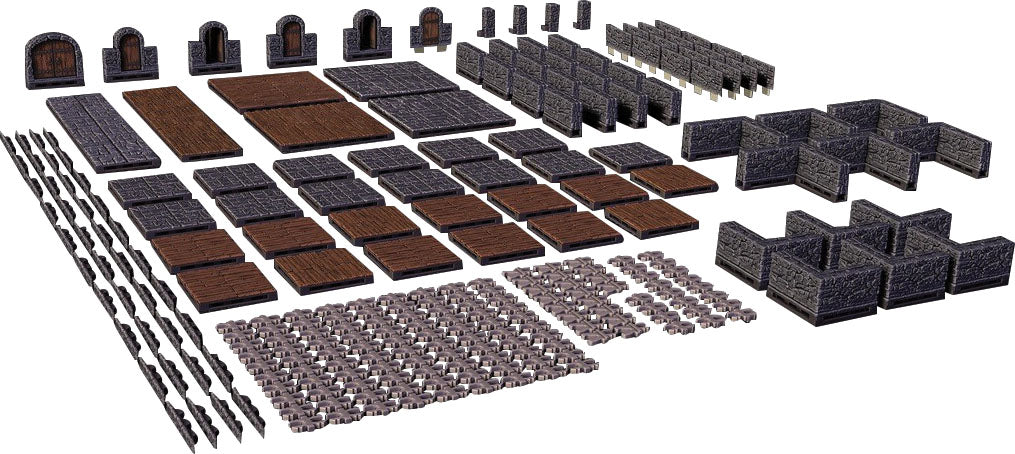 The WarLock Dungeon Tile system solves many of the problems present with other tile systems. The WarLock clips allow players to construct rooms in advance and place them on the table as needed. 1` tall walls make it easier for players to move pieces around in the room as they play. Offset walls provide you with the ability to place figures in any square on the grid, without pesky corners eating into your play area. Experience a perfect, continuous grid through the entire playspace with our patented, modular, ultra-slim interior walls. Additionally, all tiles are reversible with wood design on one side and stone on the other for double the functionality! Set Includes: 26x - 2x2 Dual-Sided Tiles, 2x - 4x4 Dual-Sided Tiles, 2x - 2x8 Dual-Sided Tiles, 18x - 2in Straight Stone Walls, 16x - 2in Straight Stone Interior Walls, 4x - 1in Exterior Wall Doors, 2x - 2in Exterior Wall Door, 2x - 1in Stone Interior Wall Door, 8x - Corner Pillars, 5x - Inside Corner Stone Walls, 5x - Outside Corner Stone Walls, 20x - Stone Edge Caps, 90x - WarLock Clips, 8x- DRAGONLOCK Adaptor Clips, 8x - OpenLOCK Adaptor Clips